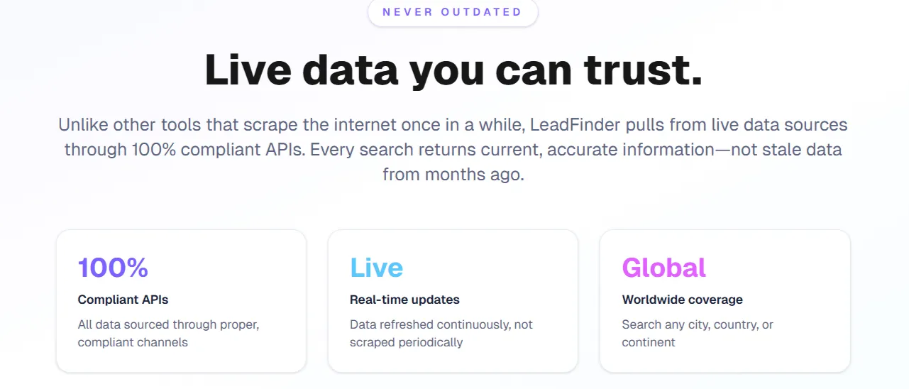 LeadFinder works differently. Every search pulls information from live data sources through 100% compliant APIs in real-time. This means you're not getting cached data, you're getting current information as it exists right now.