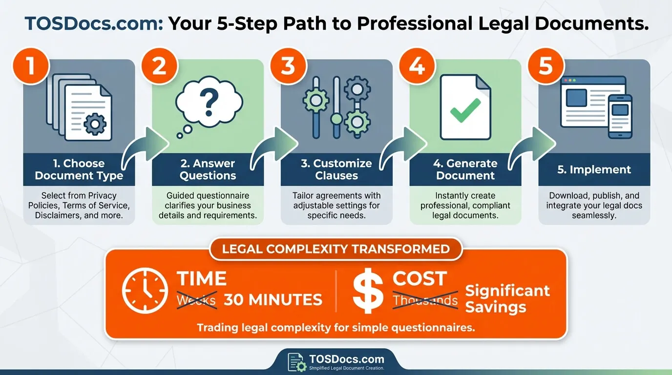 TOSDocs.com solves the fundamental legal compliance challenge: providing legitimate legal protection without requiring $5,000 lawyer budgets or legal expertise.